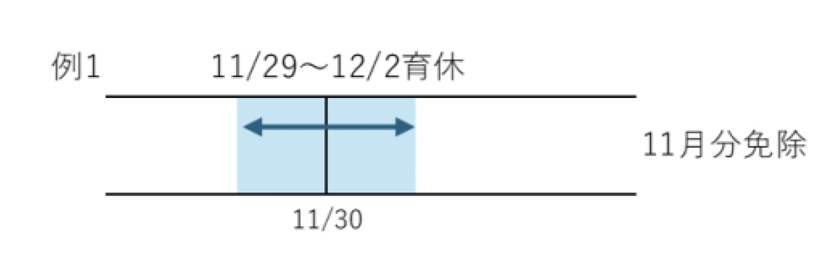 育児休業の取得日数に関わらず、月末に育児休業を取得しているときは、月末に育児休業を取得している月の社会保険料が免除となります(例1参照)。