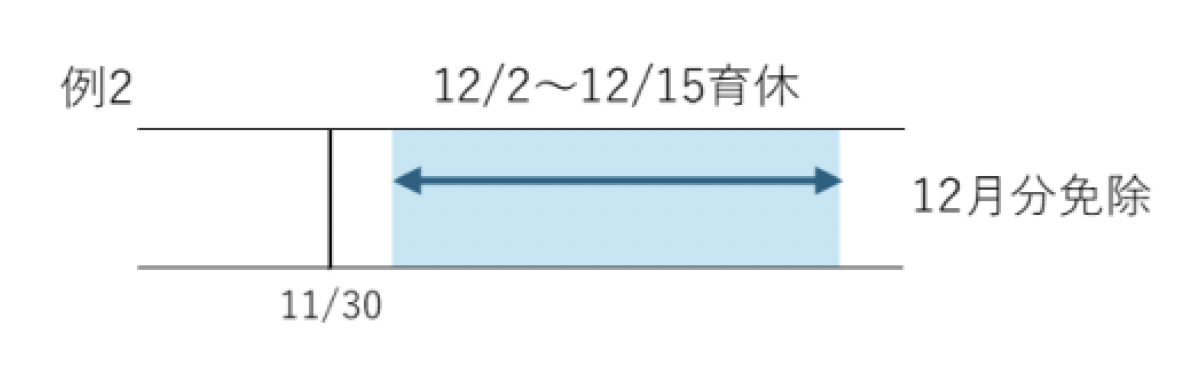 月末に育児休業を取得していないものの、育児休業の開始日が含まれる月に14日以上の育児休業を取得した場合にも当該月の社会保険料が免除となります(例2参照)。